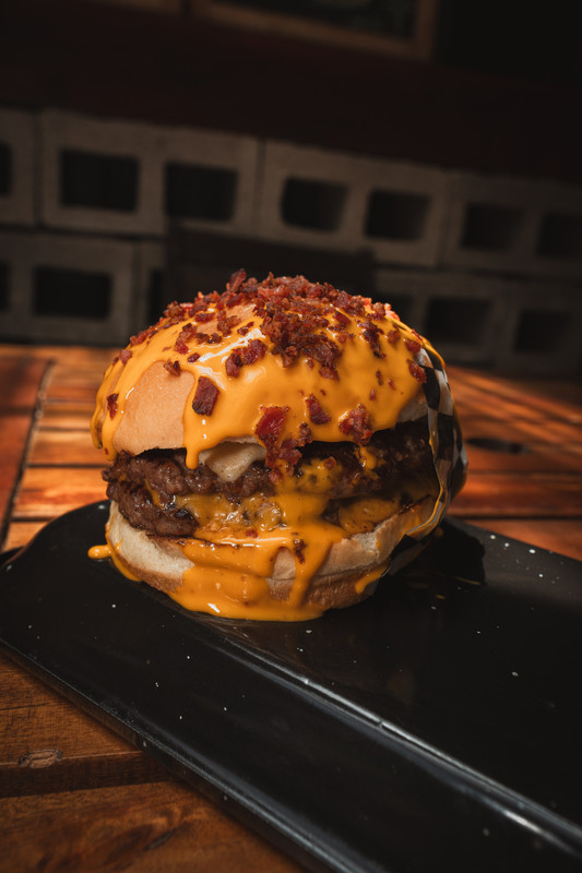 Doble Blend de 110gr, Triple queso cheddar (Tradicional, Blanco y Liquido) con lluvia de bacon crocante (Guantes incluidos)